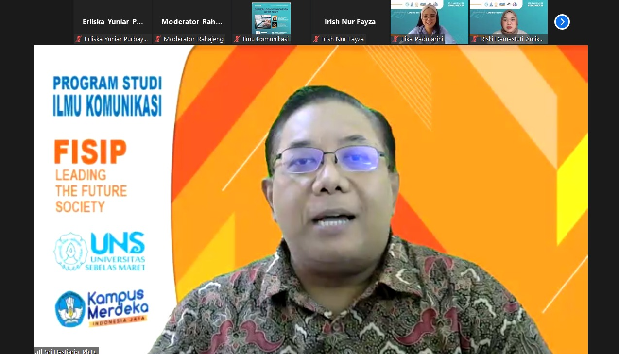 SOLO - Sebagai agenda rutin di setiap tahunnya, Program Studi (Prodi) Ilmu Komunikasi Fakultas Ilmu Sosial dan Politik (FISIP) Universitas Sebelas Maret (UNS) Surakarta kembali menggelar kuliah umum pada Jumat (1/4/2022) secara daring melalui Zoom Meeting.