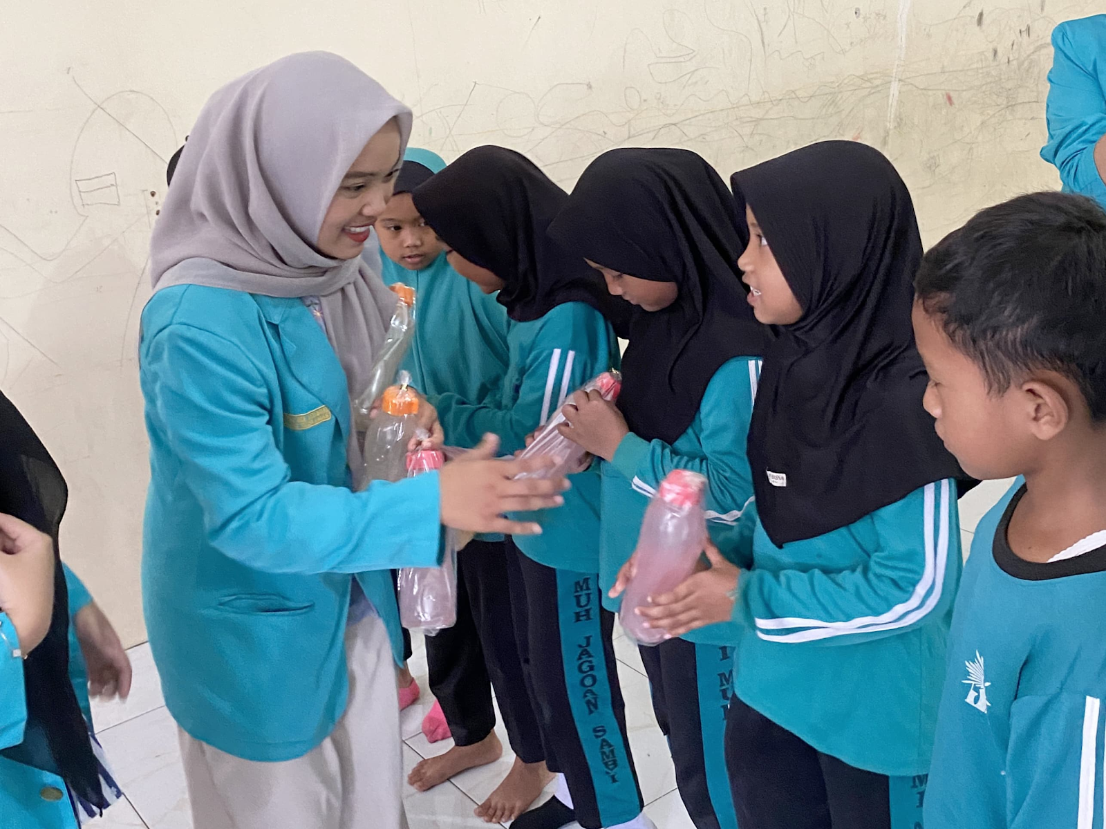 Memberikan tumbler kepada adik adik sekolah